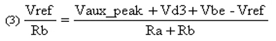 以下方程式用于调节由Ra和Rb构成的电阻分压器。Q1发射极处设置的电压应低于变压器T1二级绕组提供的额定辅助电压(Vaux_nominal)。Vref是并联稳压器D1的内部参考电压。Vd2和Vbeq1分别是二极管d2和Q1基射极电压的压降。